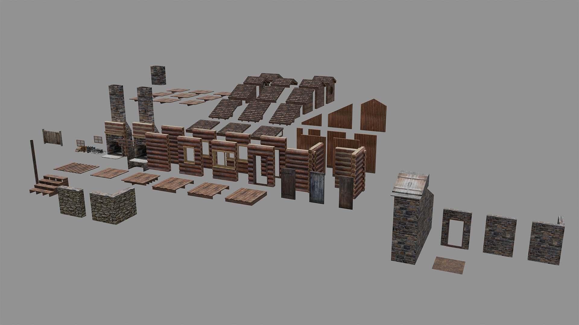 Comes with entirely modular structural pieces, including the outer walls, interior walls, foundations, roofing, porch, fireplace, and even a cellar. This pack also includes a fire animation in png format and two sample cabins to use as reference, or if you need a quick cabin for your game!